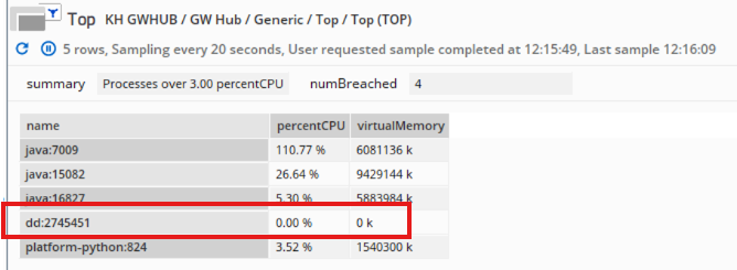 This will could happen when the PPID of the process is killed. In addition, check for the "Tail off period" setting, which you can find via GSE > Samplers > Top plugin's Advanced tab. Chances are this is enabled, having a numeric value which is in the seconds (time) format. By default, this is disabled.