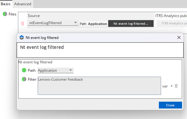 To specify a custom event log, type in the full name of the event log into the NT Event Log Filtered. The name specified should match the Full name of the event log found in the Properties window of the event log in the Windows event viewer.