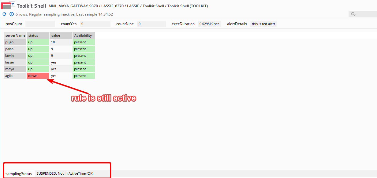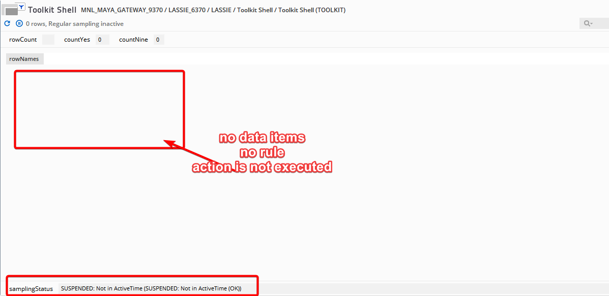 However, if the sampler becomes inactive and its dataview has no data, then the action is not executed. This is because the rule cannot find a matching data item on the said sampler: