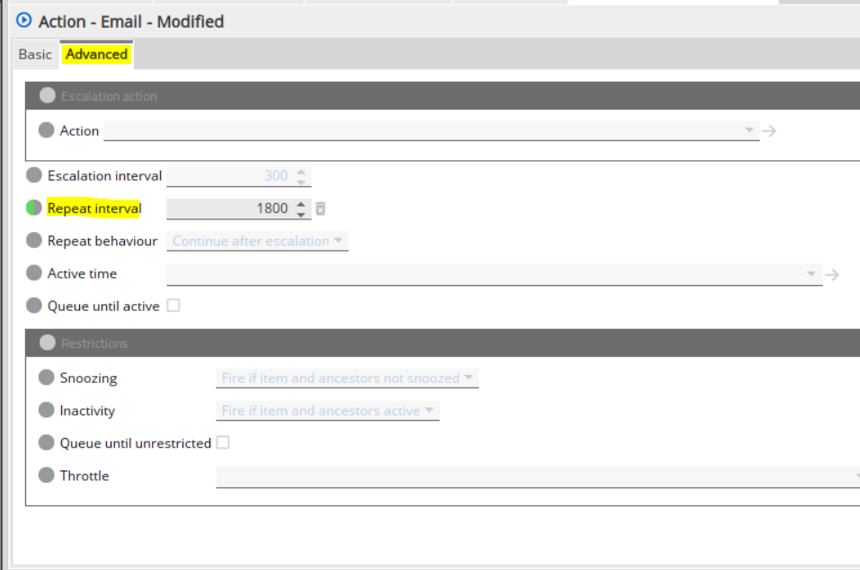 The repeat interval controls how long (in seconds) an action must remain valid before it repeats (fires again). See the section on repeating actions for more details.
