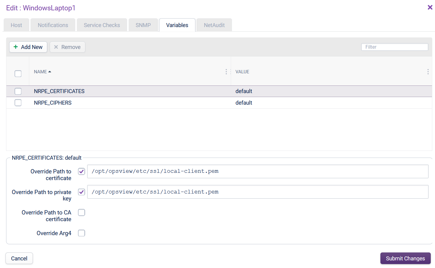 3. Since you are using self-signed certificates, you don't need to supply a CA certificate when the service check runs. You will need to confirm that you don't have a value entered for the '-r' option (path to CA certificate) with the arguments used for the service check. These arguments will hold the path to where the certificates are located from the collector that is monitoring the host. If you notice a CA path is being listed in your Variables under Host settings, you can uncheck the box and leave it blank. If you make any changes, click the Submit Changes button and then run Apply Changes.